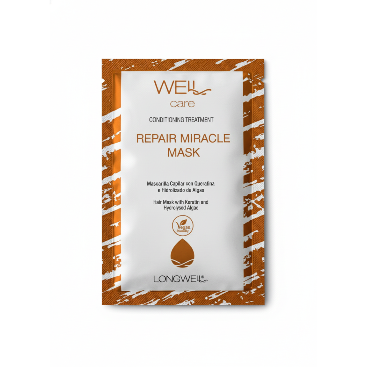 Mascarilla Reparadora REPAIR MIRACLE MASK especialmente indicada para cabellos frágiles, secos, dañados y con falta de brillo. Formulada con Queratina, Hidrolizado de Algas, Ínula Marítima, Oligogeline y filtro solar, que actúan ayudando a reestructurar y reparar la fibra capilar en profundidad. Su efecto reparador deja el cabello hidratado, nutrido y flexible sin apelmazar, intensificando su brillo natural. El cabello muestra signos de recuperación y se hace más fuerte y resistente, otorgándole un aspecto sano, sedoso y luminoso.
